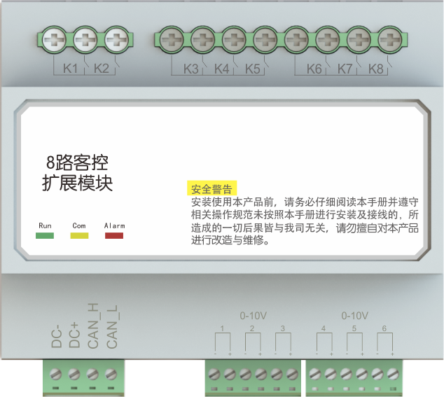 YS-RMK-8-61、K1-K8,8路均為6A輸出若受控設(shè)備為窗簾,允許接入至多3組窗簾負(fù)載接入位置分別為1:K1 K2 2:K3 K4 3:K6 K72、24V電源接口3、通訊接口:1路485總線通訊。4、6路0-10V調(diào)光信號(hào)5、具有開(kāi)關(guān)邏輯控制,延時(shí)功能.6、尺寸:108mm*88mm*66mm