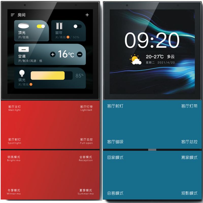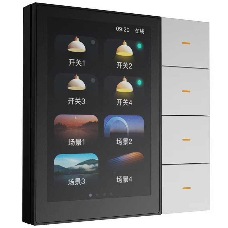 3.5寸觸摸高清屏、按鍵PC材質(zhì)。四路繼電器輸出、8路場景綁定、四路調(diào)光、2路窗簾綁定。顏色:白/灰